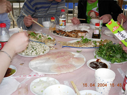 虹鳟鱼、金鳟鱼或被清蒸,或被烧烤,还有切成生鱼片的,做成鱼汤的,配点其他小菜,一顿美味鱼宴拉开了帷幕。唱着歌,玩着小游戏,品着虹鳟鱼,几多轻松惬意。