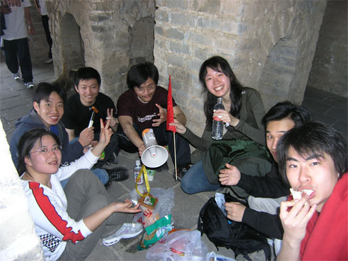 在慕字八台,大部队向九台方向进发,其他人则向七号台奔去。刚开始,大家体力都不错,片刻便将几个烽火台甩在身后,待到了十四号台,便有几个“病号”坚持不住了,于是大家又开始拉歌,高高的长城上迸出来的歌声尤显豪迈,这大大鼓舞了士气。望长城内外,正是山花烂漫时,大家不时停留拍照,或单人,或合影,每一张笑脸,每一个姿势都被收入美好的回忆。临近中午时分,大家决定停下来补充点能量了。找个空间大点的烽火台,席地而座,在烈日下攀登了好久,大家早已又饥又渴,这时候吃上美味的烤鸭,喝上香甜的牛奶,阵阵凉风袭来,真是至上的享受呀。经过修整,大家又精神抖擞了,一鼓作气,最西端的慕字二十号台便在我们脚下了。登临高处,再看身后那条巨龙,豪迈之情又一次溢满心间。