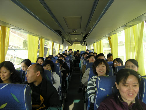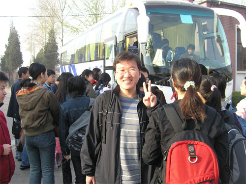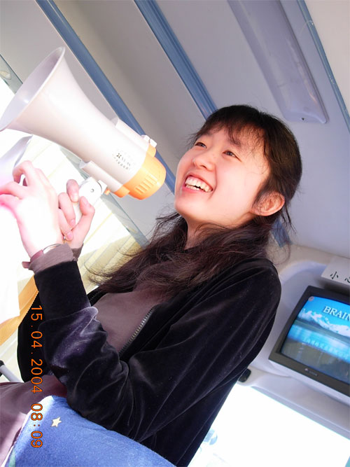 对本次春游的安排介绍完毕后,刘佳凝话题一转,开始进入有奖竞猜时间。从北京的区县概况到慕田峪的植被覆盖,从怀柔的特产到督修长城的大将,从虹鳟鱼的产地到其名字的来历,地理、历史、生物等知识无所不包,抢答声此起彼伏,车内一片欢腾。佳凝同学绘声绘色的笑话和有趣奖品的分发更是让欢声笑语一路飘出窗外。稍作休息后,各实验室之间的拉歌又开始了,为了能为本实验室顺利拿回作为奖品的风筝,各实验室代表或主动上前,或由本实验室人员共同推荐,都一展歌喉。没有卡拉OK伴奏的歌声同样优美,掌声倍加热烈,一颗颗年轻的心在歌声掌声中碰撞着,共同传达着对生活的热爱,对未来的憧憬。