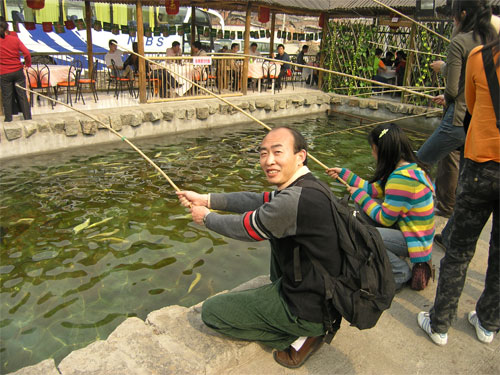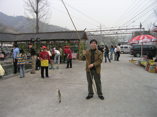 在长城脚下全体人员合影留念后,大家驱车前往以烹饪虹鳟鱼著称的“渔家傲”。虹鳟鱼因为身上有一道恰似彩虹的红色纹线而得名,以肉质鲜美而著称,很多人此前只是听说,并未亲见。这次,大家不仅有幸品尝到美味的虹鳟鱼,更有机会体验了一把垂钓的悠然自得。