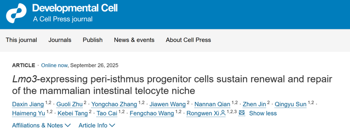 2025年9月26日,北京生命科学研究暨清华大学交叉医学研究院袭荣文团队在《Developmental Cell》期刊上在线发表了题为“Lmo3-expressing peri-isthmus progenitor cells sustain renewal and repair of the mammalian intestinal telocyte niche”的研究论文。该论文首次发现一群位于哺乳动物肠峡部(isthmus)的特络细胞祖细胞(telocyte progenitor cells,简称TeloPCs)负责肠道特络细胞的稳态维持和再生。在正常情况下,TeloPCs通过缓慢的增殖与迁移分化,维持隐窝和绒毛周围特络细胞的更新。当特络细胞层受损,TeloPCs可以被激活,快速修复特络细胞层,从而迅速重建肠道干细胞的自我更新与分化微环境。