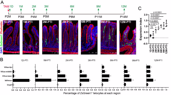 由于Lmo3+ 特络细胞在胚胎小鼠中能够产生肠道内所有特络细胞亚型,那么在成年小鼠中,聚集在肠峡部周围的Lmo3+ 特络细胞是否也具有类似能力呢?为此,研究人员在出生后两个月的成年小鼠中标记了这群肠峡部周围的Lmo3+ 特络细胞,并通过长期的谱系追踪发现,这些最初位于肠峡部周围的Lmo3+ 特络细胞能够缓慢地产生并更新隐窝周围和绒毛周围的特络细胞。根据对细胞迁移过程的分析,一次完整的特络细胞层的更新大约需要6到12个月的时间。因此这些细胞代表了一类相对静态的多能干细胞,研究人员将它命名为特络细胞祖细胞(telocyte progenitor cells,简称TeloPCs)。